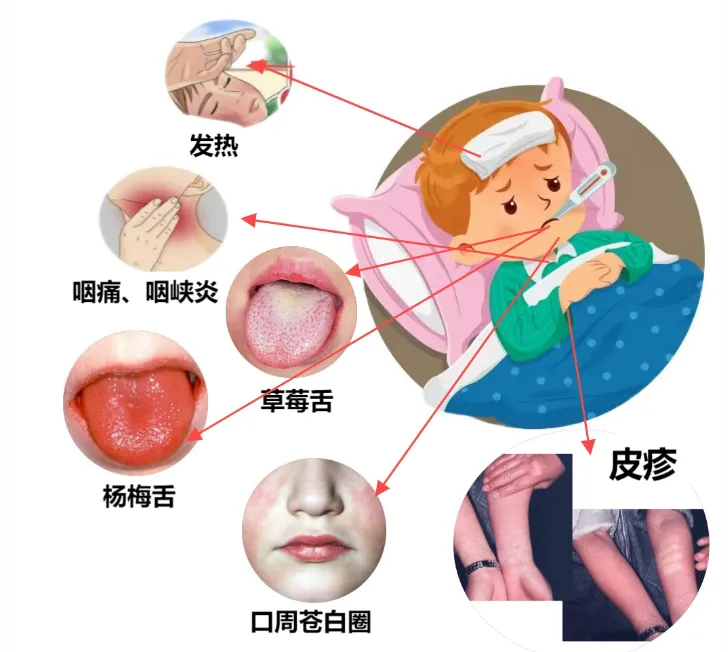 症状特点:高热、咽痛咽红(甚至化脓)、“草莓舌”、全身弥漫性红疹,疹退后脱屑。