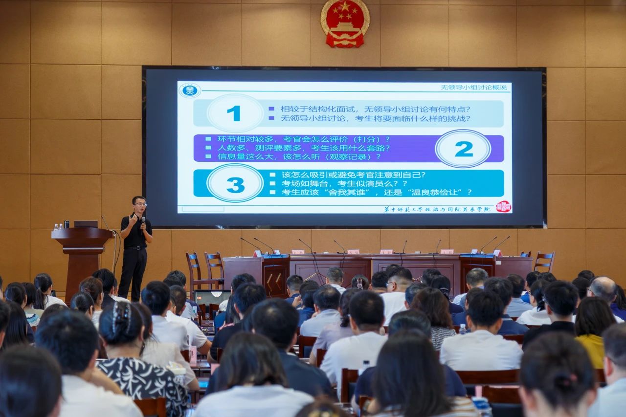 开班当日特邀华中师范大学、市委党校的专家教授开展理论培训,采用“理论讲解+现场演练+专家点评”的互动模式,围绕无领导小组讨论的核心技巧、路演内容设计与应答策略、舞台表现力提升等关键内容展开系统教学。