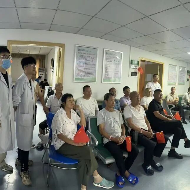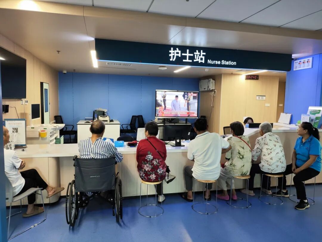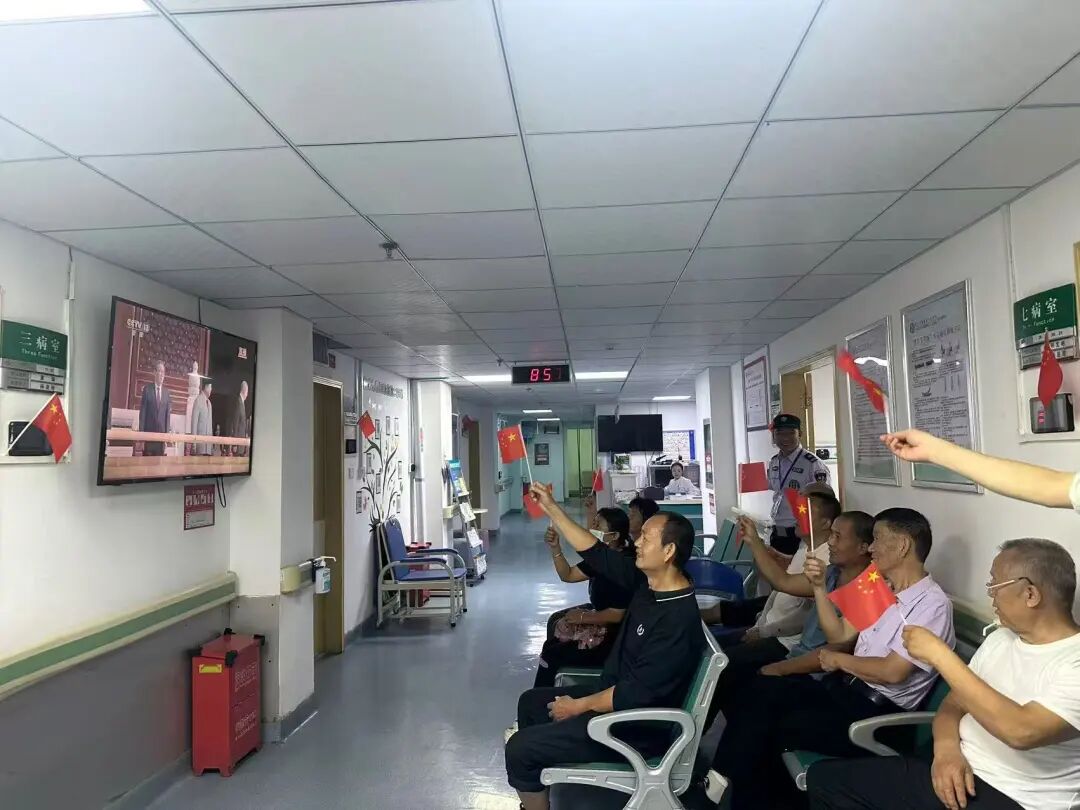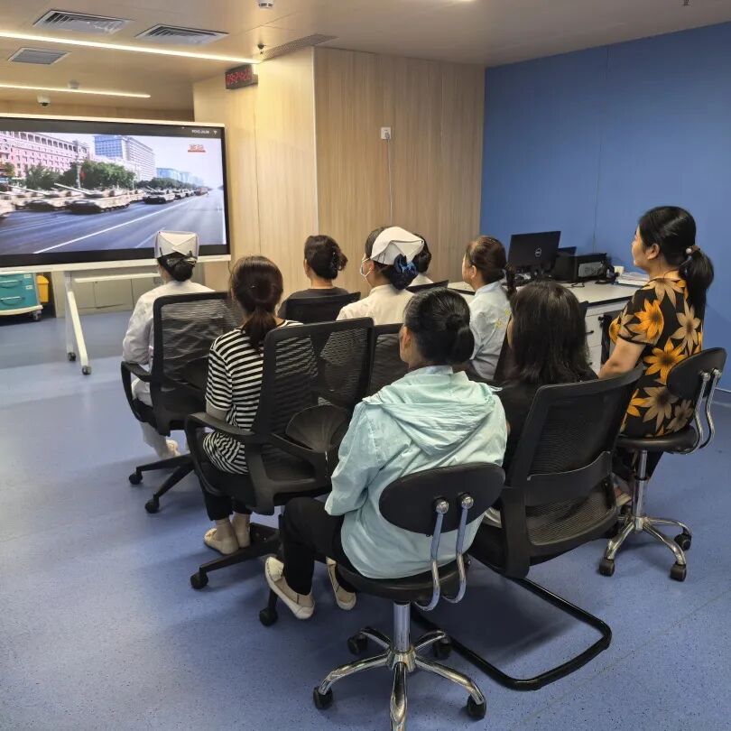 与此同时,医院各临床科室也将红色氛围延伸至患者身边。科室医护人员提前调试设备,在病房公共区域、护士站旁的显示屏上同步播放大会直播。不少患者及家属暂时放下手中的事情,围在屏幕前认真观看。一位年近八旬的患者看着屏幕里的画面,激动地向身边人讲述过去的故事,“当年的苦日子我亲身经历过,现在祖国这么强大,再也不用怕受人欺负了!” 朴实的话语里,满是对如今幸福生活的珍惜,也感染着在场的每一个人。