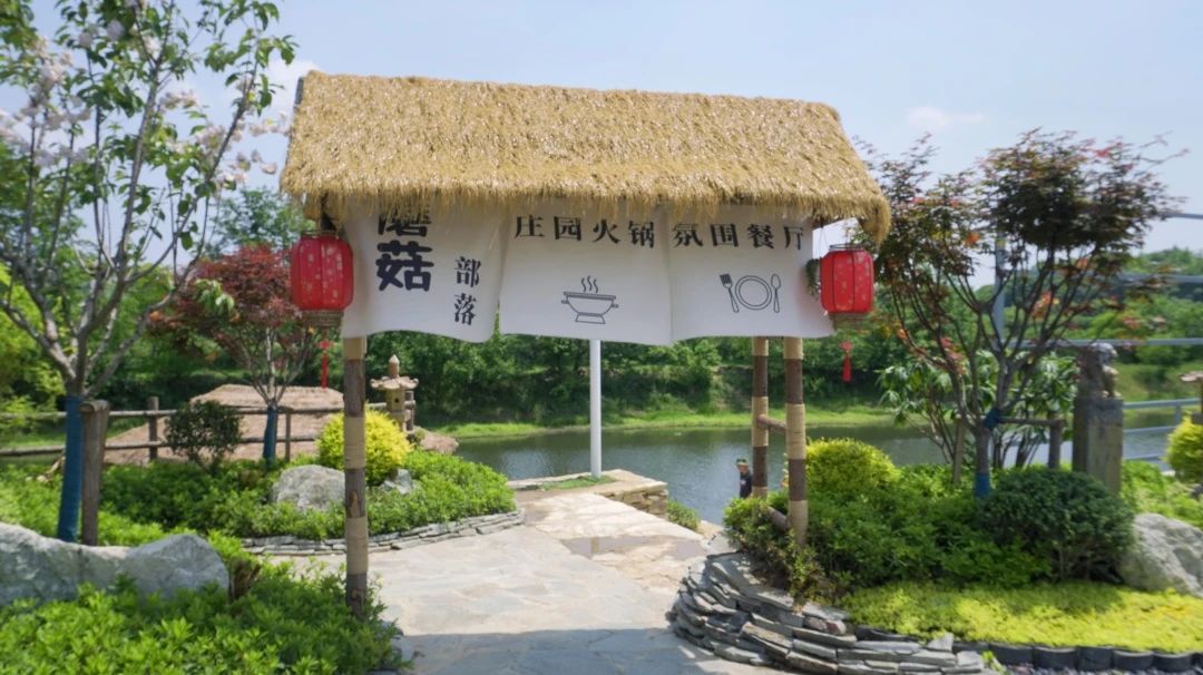 走进蘑菇部落·庄园火锅,一眼望去,只见蘑菇元素遍布庄园的每个角落,沿河边还建设有20余座星空房和凉亭供餐饮所需。