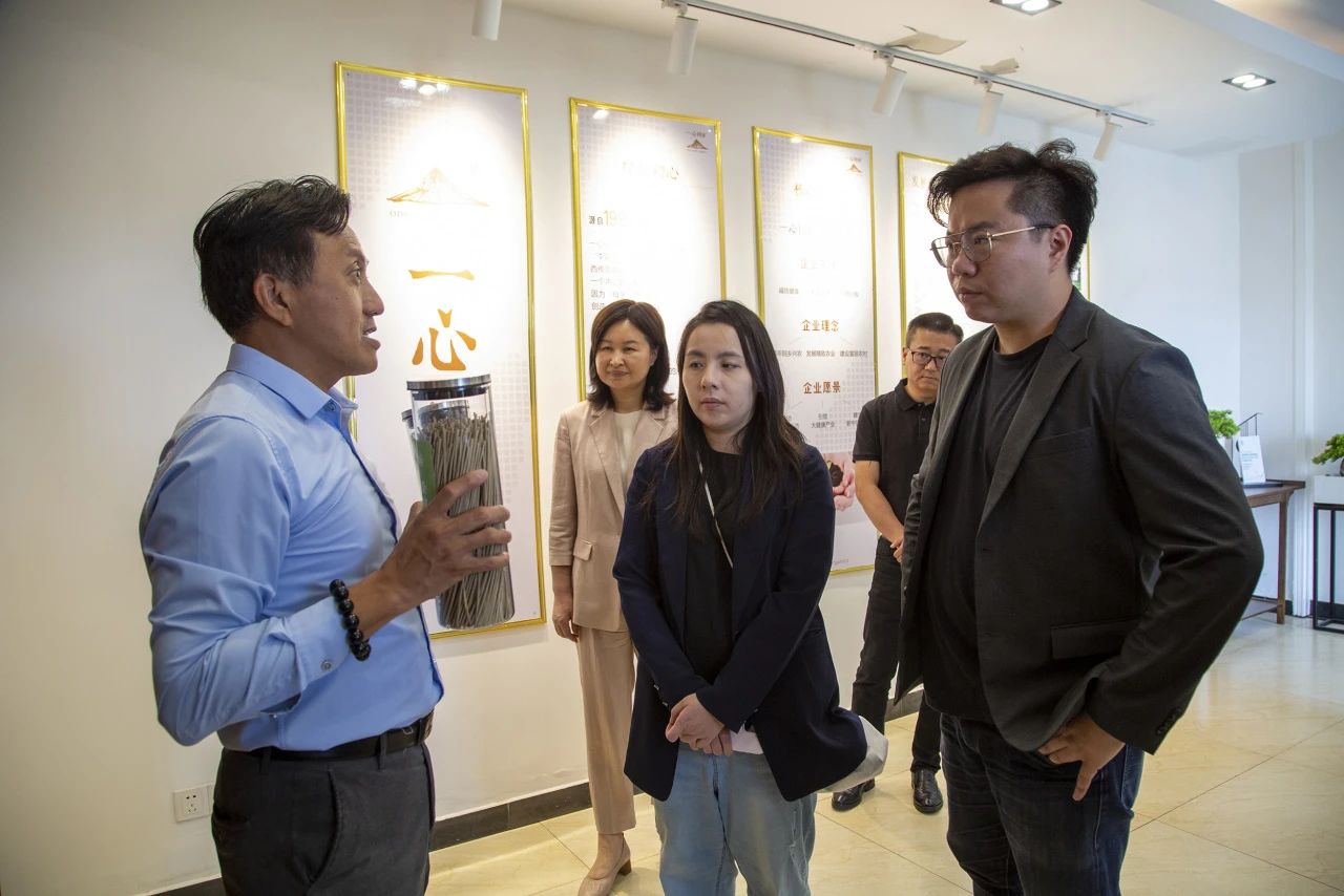 在农场展示区,武汉“一心回乡”生态农场总经理蔡三益为苏恒一行介绍了农场落户黄陂以来的发展情况,分享了农场的种植模式和未来规划,同时,展示了农场推出的生态无花果干、洛神花茶、三益大米等有机农产品。