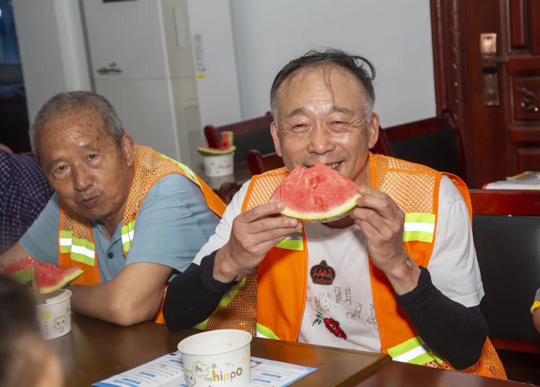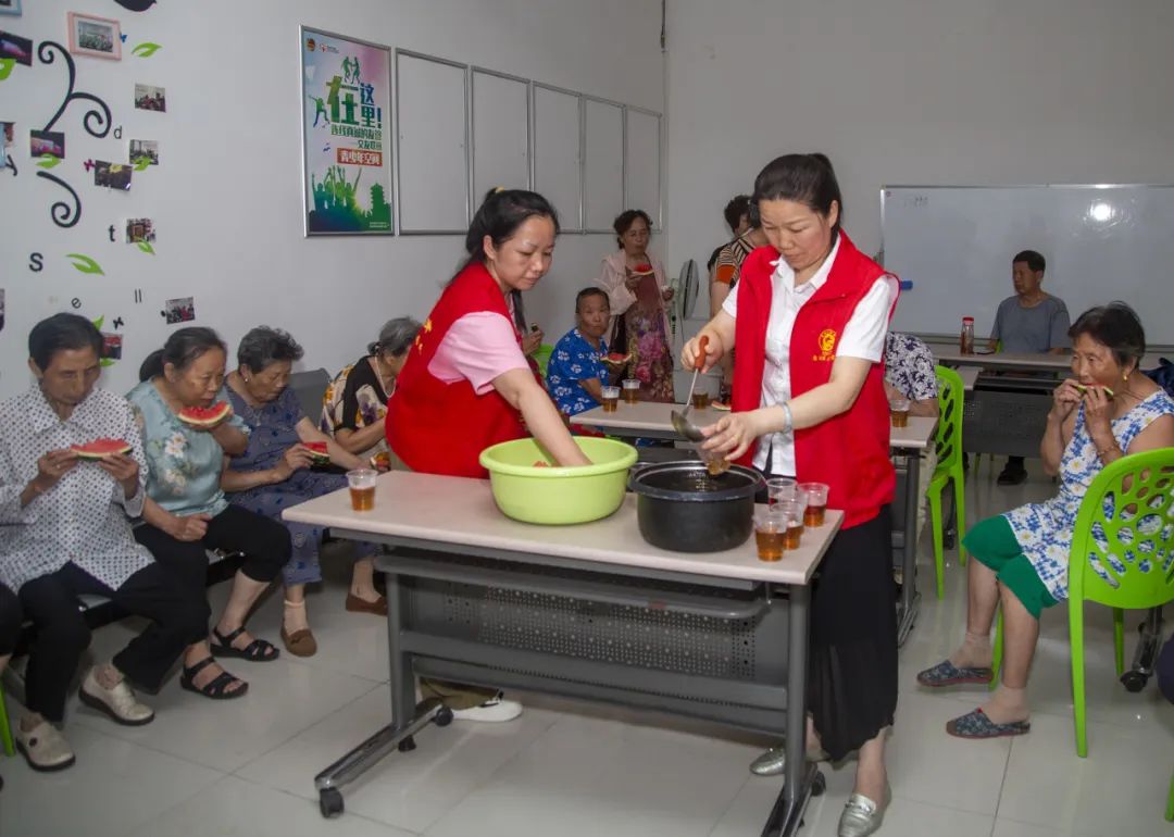 沙港社区工作人员和志愿者为大家准备了西瓜和绿豆汤,社区党支部书记王安桦耐心地嘱咐前来纳凉的居民要注意防暑降温。
