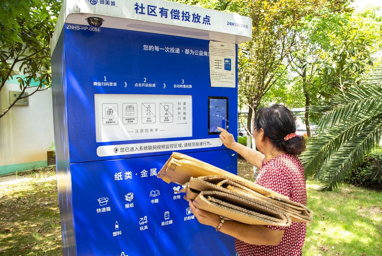 在盘龙城歌林花园小区智能回收箱前,几位小区居民拎着塑料瓶、纸板箱、废旧书报有序投放,居民只需要输入手机号码或者微信扫码,回收箱仓门便会自动打开,在纸箱投递进去后,机器立马称出重量,并计算回收费用。点击确认,结算的收益即进入了个人账户,整个过程不到半分钟。