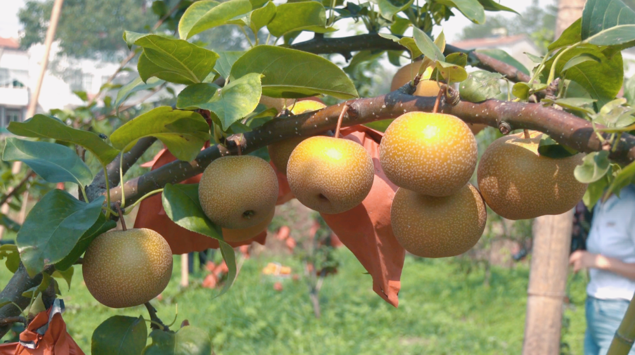 走进田刚的果园基地,连片的梨树枝叶繁茂,沉甸甸的秋月梨挂满枝头,个个圆润饱满,压弯了枝,游客们正兴高采烈地忙着采摘。听说这里的环境非常好,陈萍特意从武汉赶过来体验。“确实来了以后,发现水果很好,摸起来也光滑,试吃了一下,又细腻又甜。”