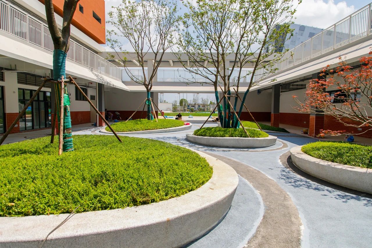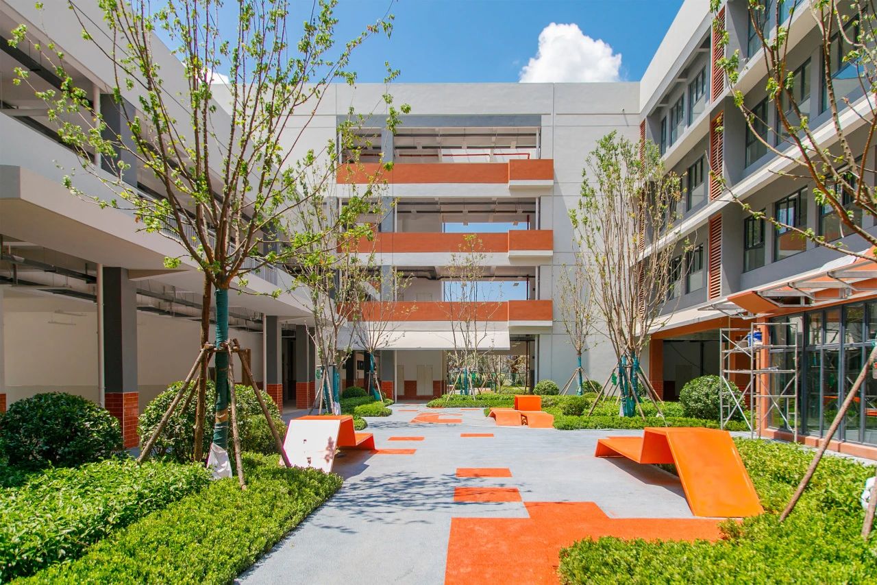 现代简约风格的建筑之间种植着高矮错落的乔木,将校园装点得生机盎然。教室内桌椅摆放整齐,慧眼灯、镶嵌式黑板等设备已安装完毕。教室外消防设施、广播喇叭等也一应俱全。