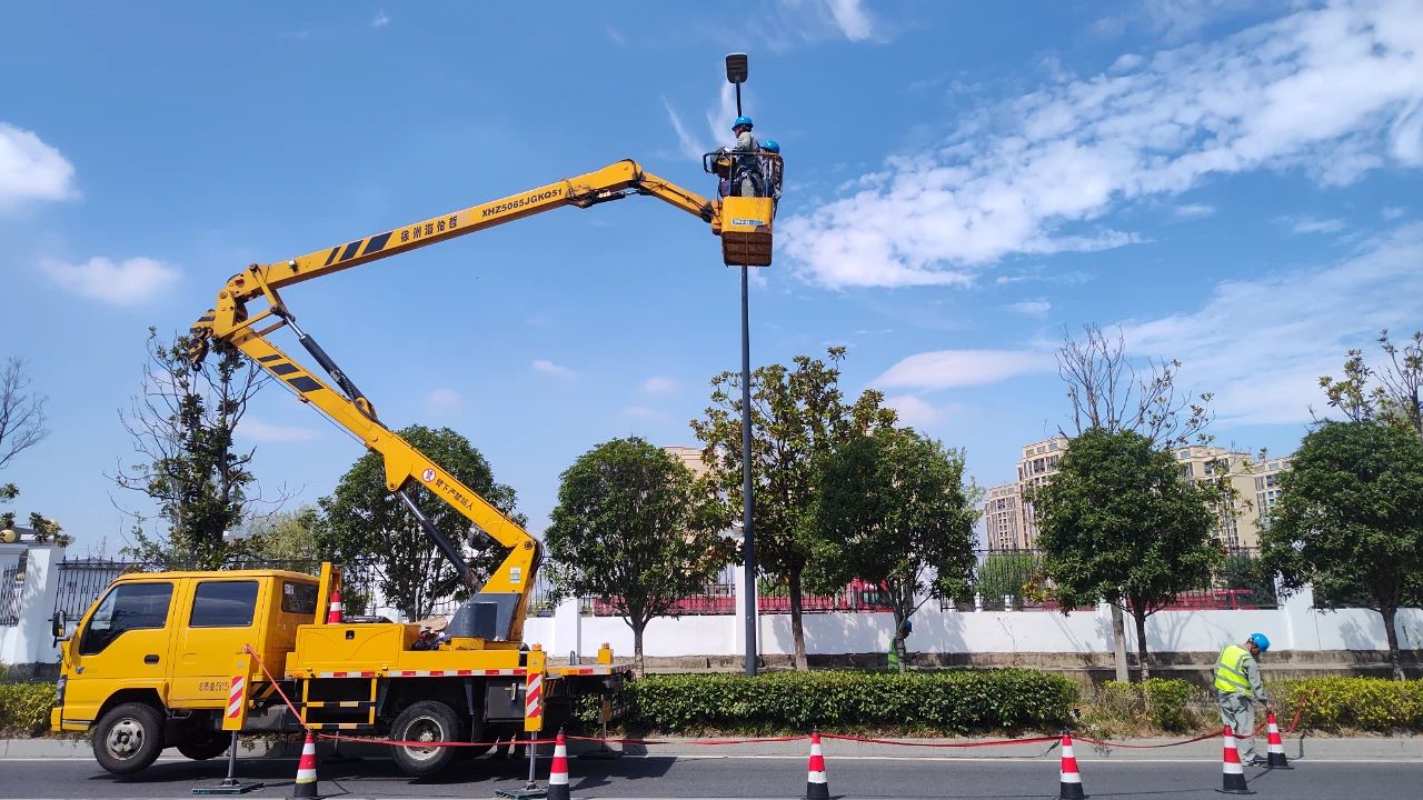 在前川街百泰路,检修人员身穿工装,头戴安全帽,站上登高车升降斗,升上十多米高,手持专业工具小心打开灯罩,对每一盏路灯进行严谨、细致的“体检”,发现破损路灯立即更换。