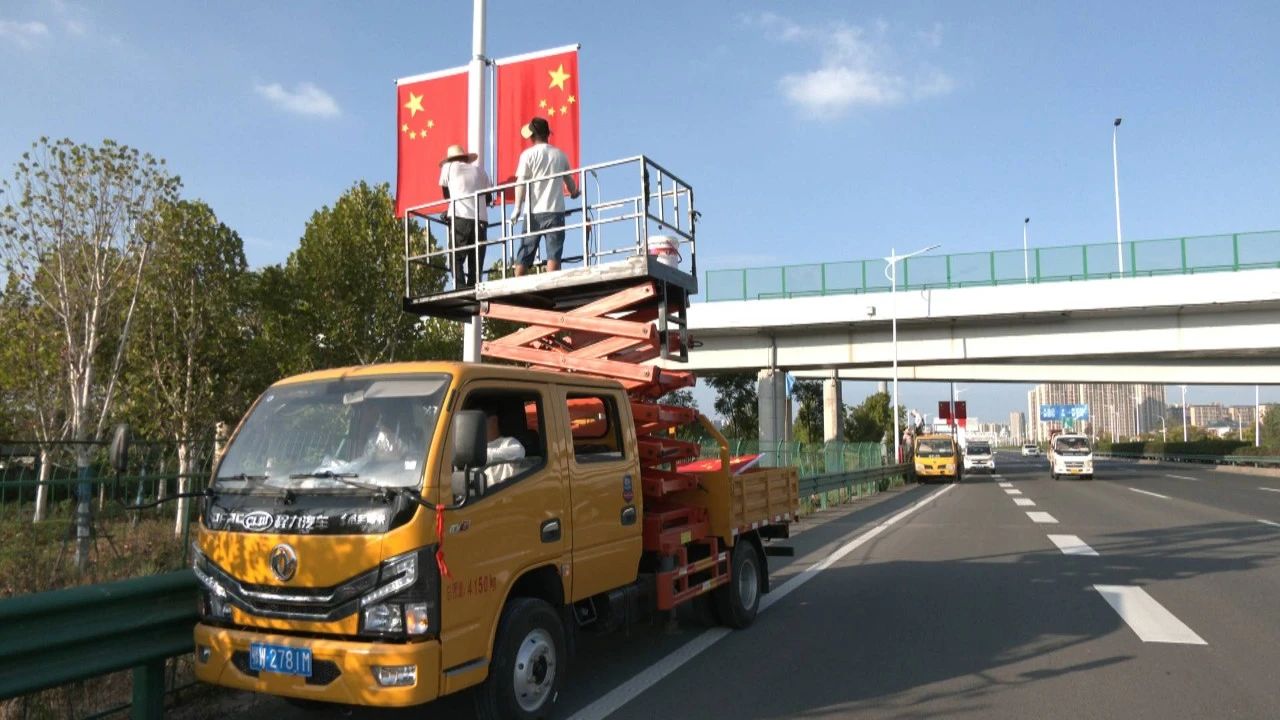 9月21日,记者在岱黄高速公路看到,楼凤网 城管局正组织工作人员在悬挂国旗,他们两人一组,采用登高车施工,协作分工,配合默契。施工人员细致地将国旗展开,安装在灯杆上,并认真调整好悬挂角度与位置,安装好固定支架和螺丝,确保做到整齐划一,美观大气。