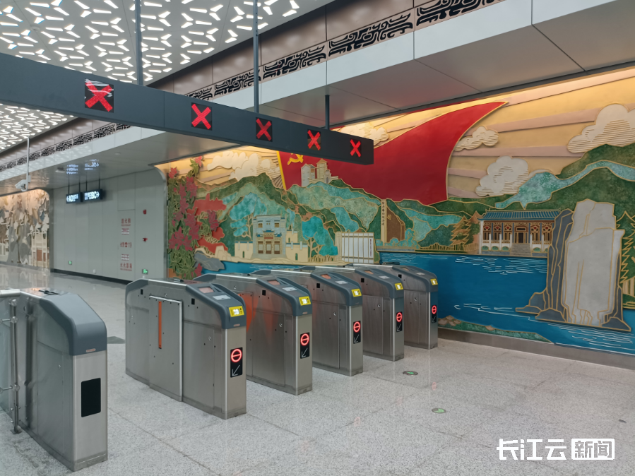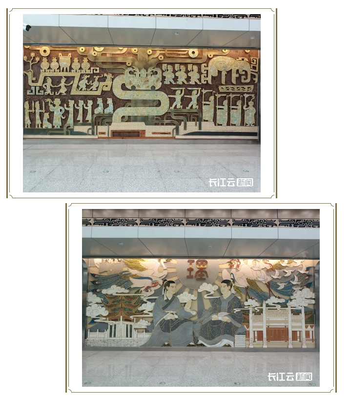 走进特色站黄陂广场站,以白色与铜色为颜色基调,烘托出黄陂不断走向现代、繁荣的地域气氛,站内将盘龙文化,木兰花景、民居建筑等独特的文化元素提炼成几何形态,巧妙设计于天花柱面中,乘客抬头便能看到繁茂的木兰花景,柱体结合仿生形态呈现生长态势,与天花灯具交相呼应,每一面艺术墙都讲述着不同的地域故事,一站一景的艺术空间为乘客展现了黄陂的魅力景象。