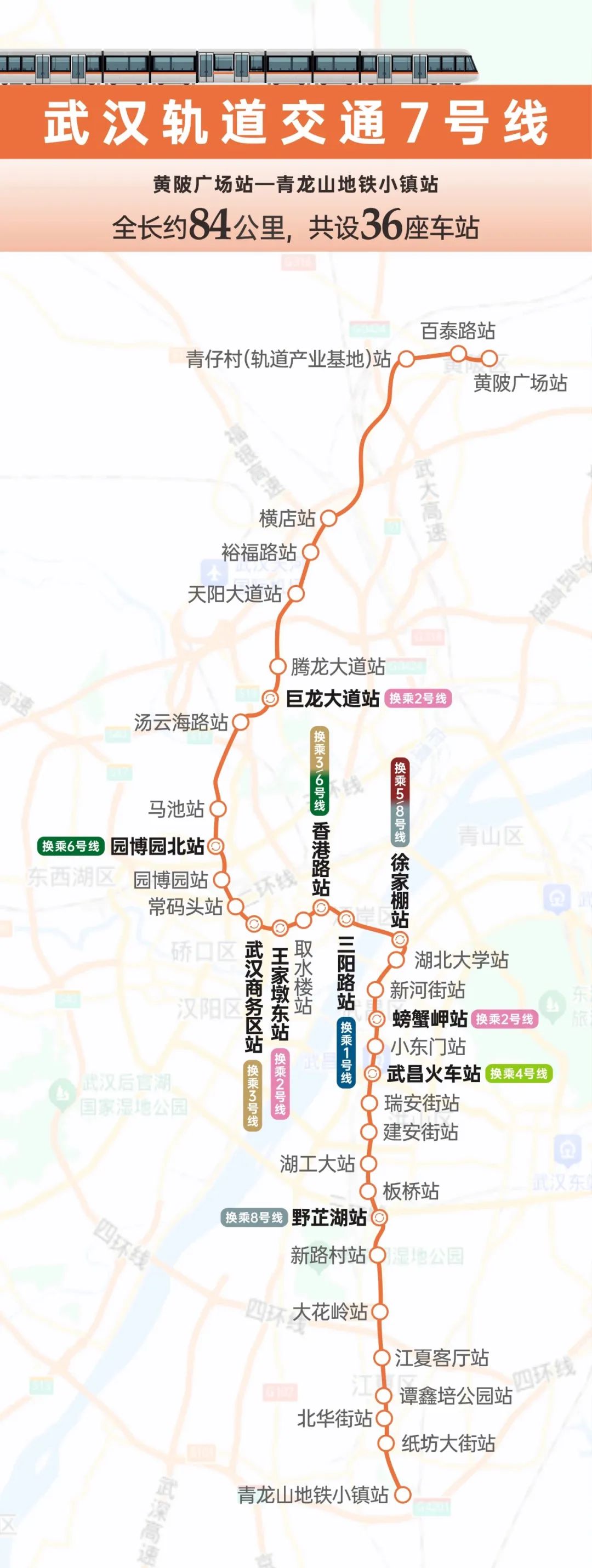7号线全线共有换乘站10座,可与1、2、3、4、5、6、8号线共7条线换乘,前川、横店、盘龙城片区居民前往中心城区和武汉重要交通枢纽都非常方便。