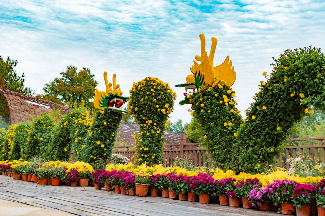 经过精心布置的花海之中,弯曲的小径引导着游人的脚步,一组组创意造景巧妙地融入其中,趣味横生的十二生肖,翩翩起舞的蝴蝶,各式菊花造型不仅彰显着大自然的鬼斧神工,也体现了园艺师们的匠心独运。
