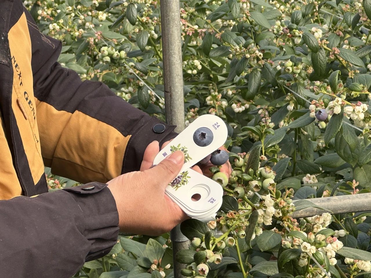 科技的力量,不仅体现在时间的提前,更体现在产量和品质的飞跃。通过科技的有力加持,基地蓝莓的亩产预计可达4000斤,远超普通地栽模式亩产800—1200斤的水平,单株产量更提升三倍以上。同时,这里的蓝莓果实品质也十分出众,直径普遍在18毫米以上,接近一块硬币大小,最大甚至可达到30毫米。技术总监陈家豪现场进行了抽样测量,“一般一枚硬币是22,这个已经达到了24+。”