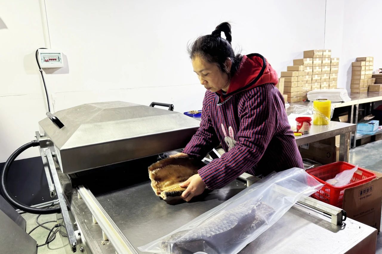 风干鱼一经推出,颇受市场青睐,2023年,公司进一步扩大产能,筹建新工厂。目前,新建设的电商产业园占地约6000平方米,涵盖风干鱼加工、仓储以及电商直播等多种业务,每年的10月至下一年的2月是风干鱼的销售旺季,今年1月份日均发货量能突破5000单。
