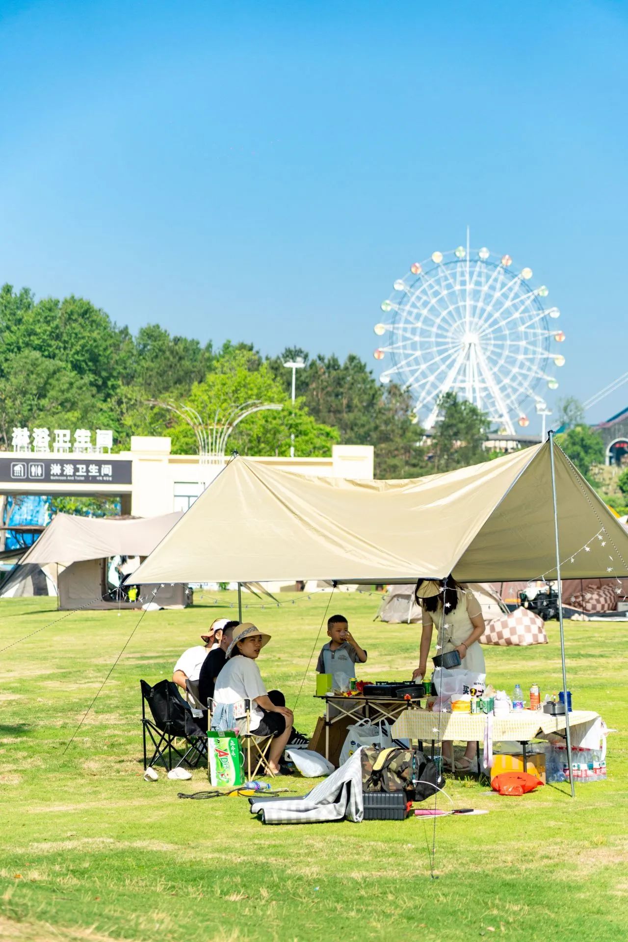 5月1日上午,游客在木兰不夜城旅游度假区阳光大草坪露营烧烤。李海纳摄