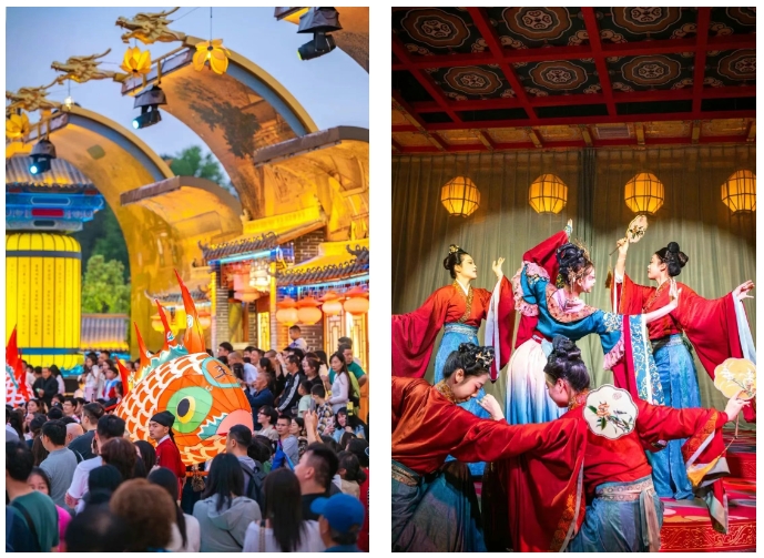 木兰花乡景区同样精彩纷呈,以“花火渔灯节”强势点燃夜经济。琉璃灯海璀璨夺目,铺满街区;4米高的非遗渔灯领航巡游,热闹非凡;打铁花等非遗火秀轮番上演,绚丽多彩,完美再现盛唐灯会的繁华盛景。此外,国潮电音节、汉服打卡、音乐烟花秀等多元业态深度融合,吸引游客“昼赏繁花享自然之美,夜游灯市品古韵风情”,全方位满足游玩需求。
