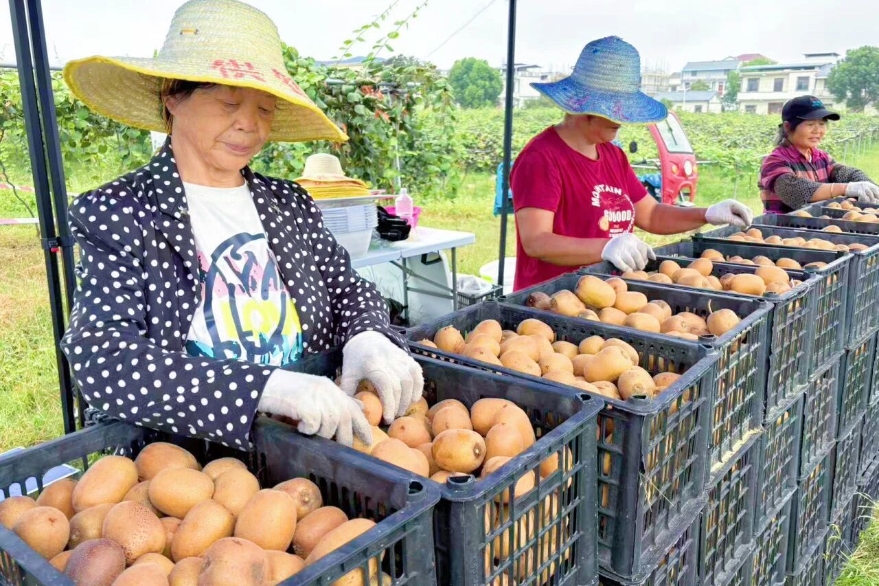 从引种到丰产,这片果园用了6年时间。2020年,武汉供销现代农业服务有限公司将猕猴桃引入木兰云雾生态观光园,经过精心管护,2023年首次挂果,今年正式进入丰产期。目前,果园通过线下与企业合作、游客入园采摘的双销售模式,日均销量2000斤左右。