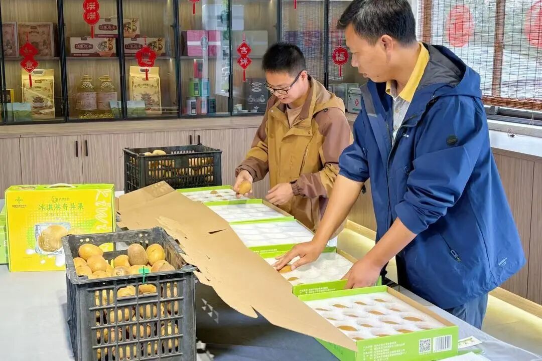 这片热闹的果园藏着“致富密码”——100亩“金山”猕猴桃是这里的“明星作物”。“跟普通猕猴桃比,它果形大,糖酸比低、糖度高,口感特别出众。”园区农技人员吴晨斌拿起一颗饱满的果实介绍,独特品种让果子成了市场“香饽饽”。