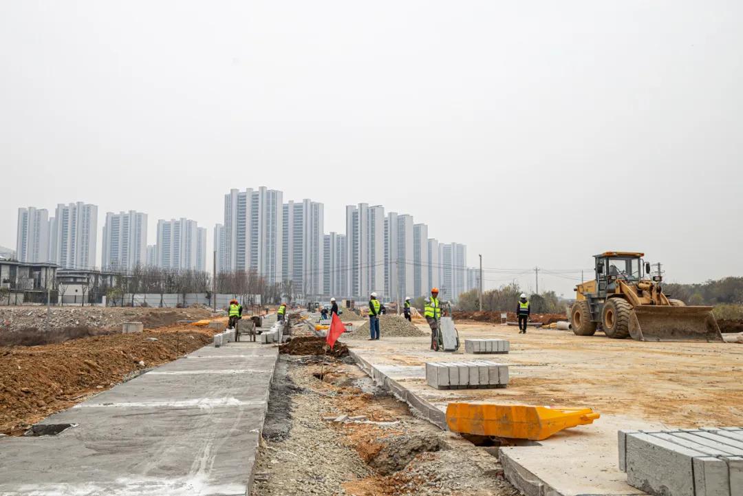 连日来,甘露山文创城沿河路(钓台道-G318)道路工程建设现场一派繁忙,工人们正加紧推进非机动车道和给排水工程施工,全力冲刺春节前具备通车条件的目标。