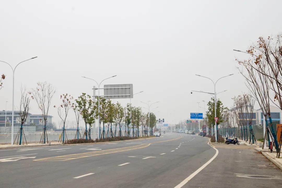 作为服务甘露山文创城的重要配套道路,沿河路工程北起规划钓台道,途经横四路、横五路、横六路,南至G318,线路全长1141.093米,红线宽度30米。项目按照城市更新理念和城市次干路标准建设,采用双向四车道设计,同步配套道路、排水、桥梁、交通、绿化等设施。