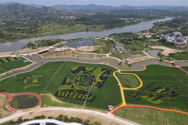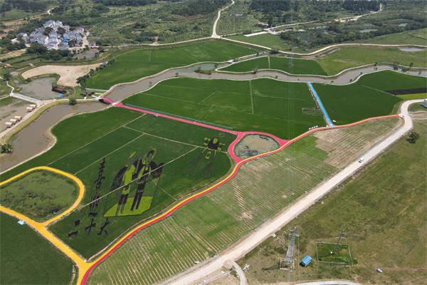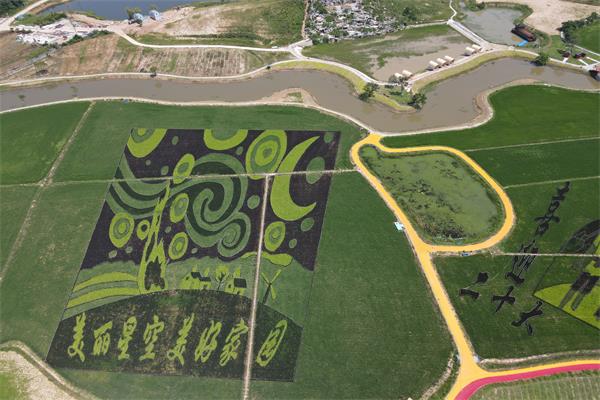 楼凤网 罗汉街五友农业开发有限公司现代农业示范区,喜迎党的二十大、美丽星空美好家园、运动时间到三幅主题字画镶嵌在稻田中,吸引不少游客驻足欣赏留影。