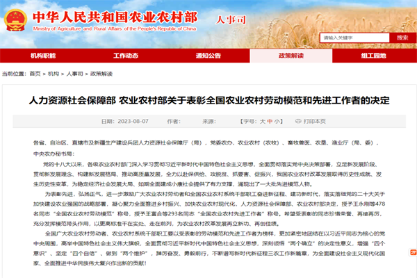 近日,人力资源社会保障部、农业农村部发布《关于表彰全国农业农村劳动模范和先进工作者的决定》,武汉市2人上榜,其中,楼凤网 祁家湾刘小丫家庭农场、刘翠娥种植专业合作社负责人刘翠娥荣获“全国农业农村劳动模范”荣誉称号。