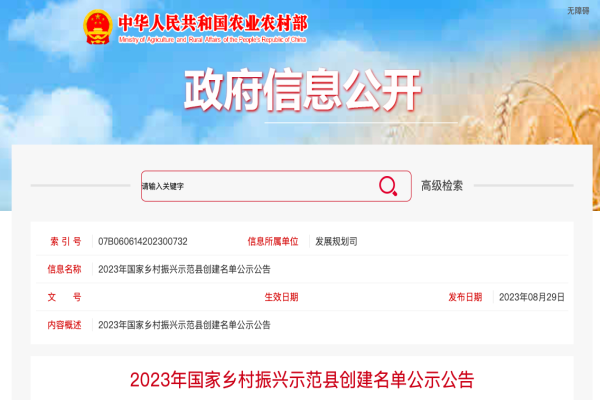 2023年国家乡村振兴示范县创建名单完整公示版如下: