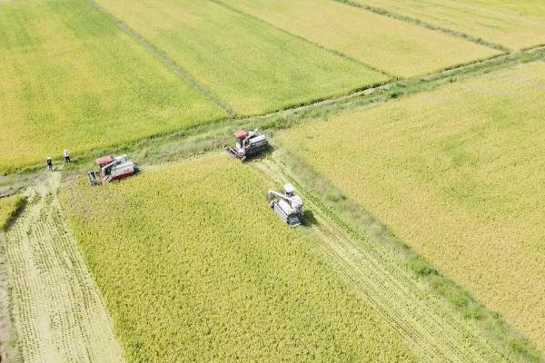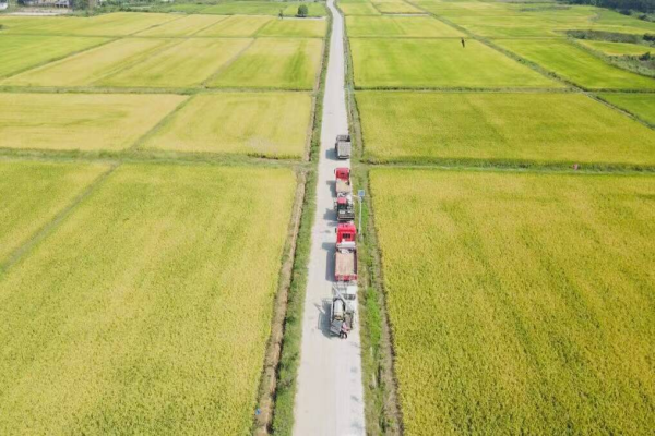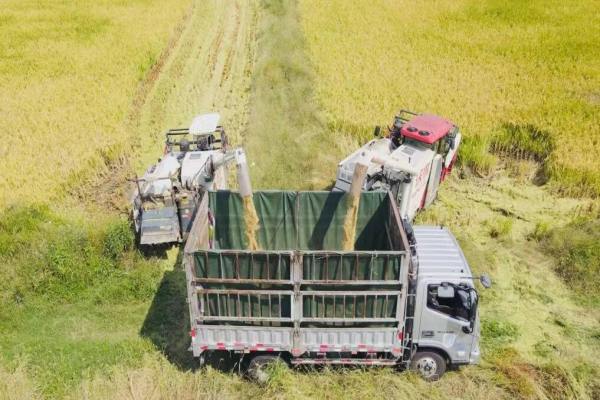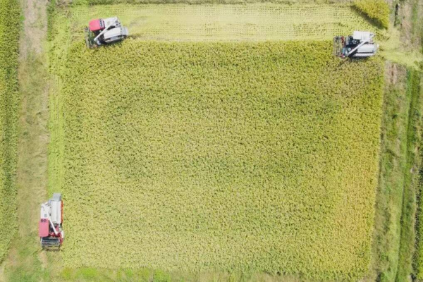 在姚家集街八里村,连片的稻谷已经成熟。从空中俯瞰,金黄的稻谷就像给大地铺上了一层金色的地毯。收割机在田间来回穿梭,切割、脱粒、粉碎稻杆等工序一气呵成,只留下铡碎的秸秆和整齐的稻茬。等待在路旁的运谷车只需装满后,就能快速返回。