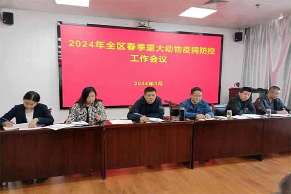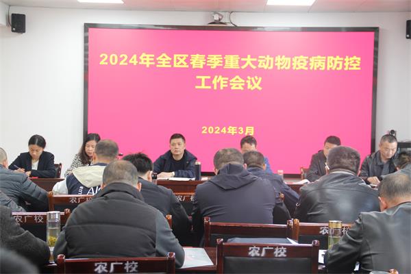 会上,徐新峰同志传达了全市春季重大动物疫病防控工作会议精神,对全区春季动物疫病防控工作进行了详细的安排部署。他强调,当前动物疫病防控形势依然严峻复杂,各相关部门要切实增强责任感和紧迫感,按照省、市文件精神,切实抓好非洲猪瘟常态化防控、疫情排查、调运监管、无害化处理、应急处置等工作,努力降低疫情发生风险,保障生猪生产稳定。