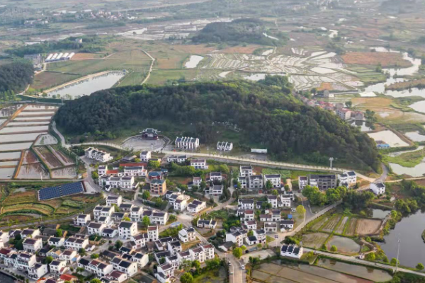 凤凰寨美丽乡村建设如火如荼,形成了光伏、油茶、茶叶等六大特色产业,有效带动农民增收致富。图为凤凰寨村俯瞰图。