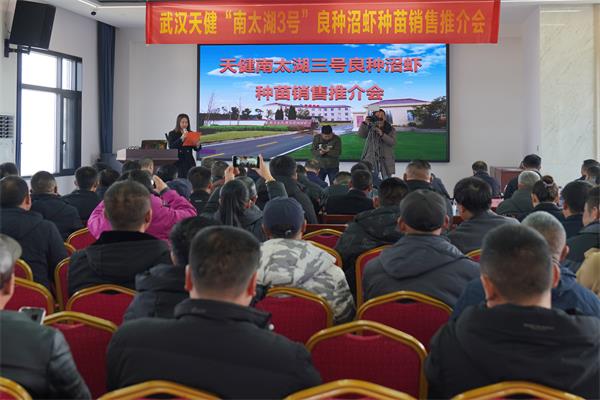 3月6日,武汉天健沼虾繁育科技公司举办“南太湖3号”良种沼虾种苗销售及技术推介会,共同探讨沼虾产业创新发展之路。省水产推广总站、省农业科学研究院、市水产推广中心、区农业农村局、王家河街道办事处相关负责人及水产养殖户、经销商、农业合作社的代表等130余人参加会议。