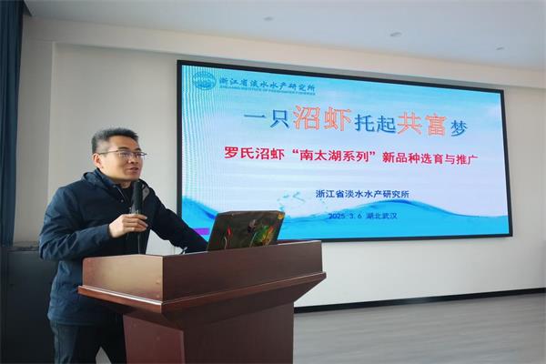 天健沼虾繁育科技公司总经理杜伟豪详细介绍了“南太湖3号”良种沼虾的培育扩繁情况、销售政策以及售后服务。浙江省淡水水产研究所主任李凤波博士阐述了该品种的特性优势及先进养殖技术,湖北省农科院专家王炬光博士分享了沼虾与水稻共作、轮作模式的技术要点与经济效益。合作公司代表粤海饲料公司黄朋飞经理分享了合作前景,优秀养殖户代表讲述了沼虾外塘养殖及与油菜轮作的成功经验。