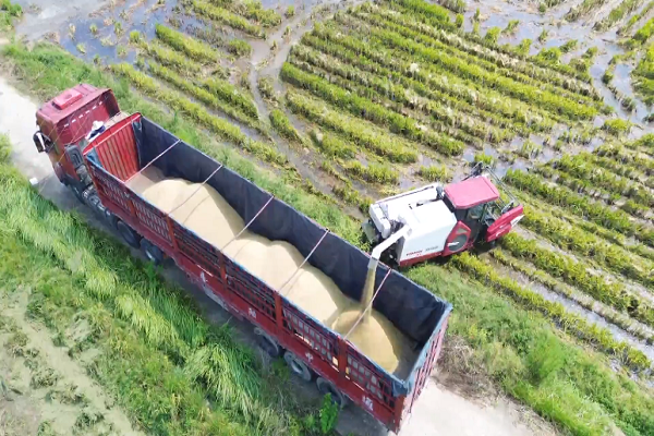 时下,在武汉永旺智慧农场的稻田里,连片的再生稻泛起金色波浪,收割机正开足马力来回穿梭,一排排水稻被整齐地割下,经过脱粒、分离、清选等流程,稻谷源源不断地输送到运输车辆上,呈现出一派繁忙的丰收景象。