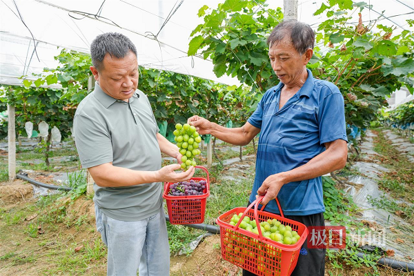 夏秋之交正值葡萄成熟的季节,十棵松村胡家湾村民胡才文的工作也进入“旺季”,一串串颗粒饱满、散发果香的巨峰葡萄、阳光玫瑰被他摘下并装箱销往武汉城区。“我今年63岁了,出门打工真的有点干不动了。”胡才文说,“在葡萄园里工作轻松不少,收入和出门打工差不多,而且就在村口离家也近,方便照顾家里人。村里不建这些果园,哪有这么好的工作呢?”
