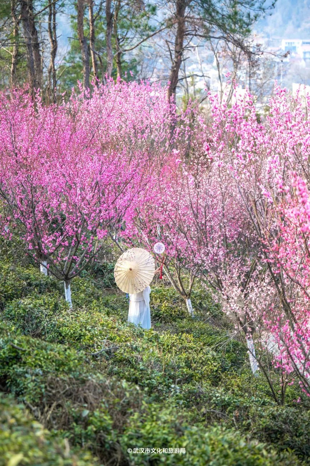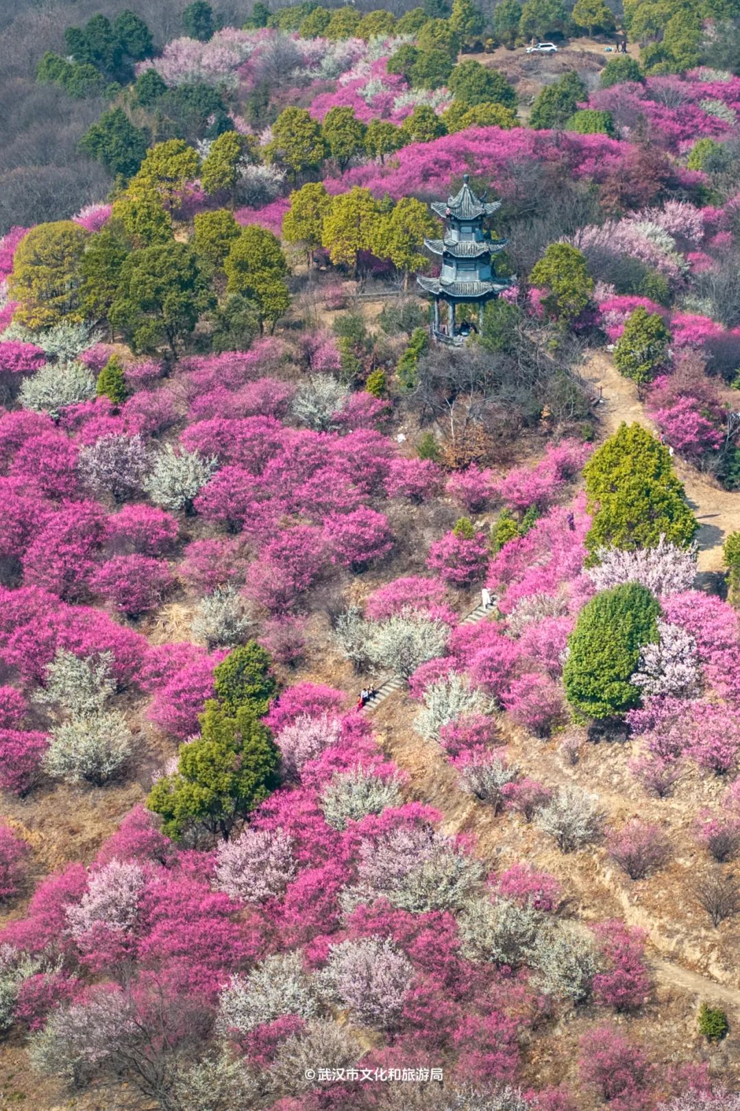 在木兰花谷,梅花傲然清雅的风骨随处可寻。几百亩梅花交错盛放,漫山遍野尽是粉黛。山间、谷中、湖畔、路旁,皆是它们肆意生长、独自芬芳的风采。
