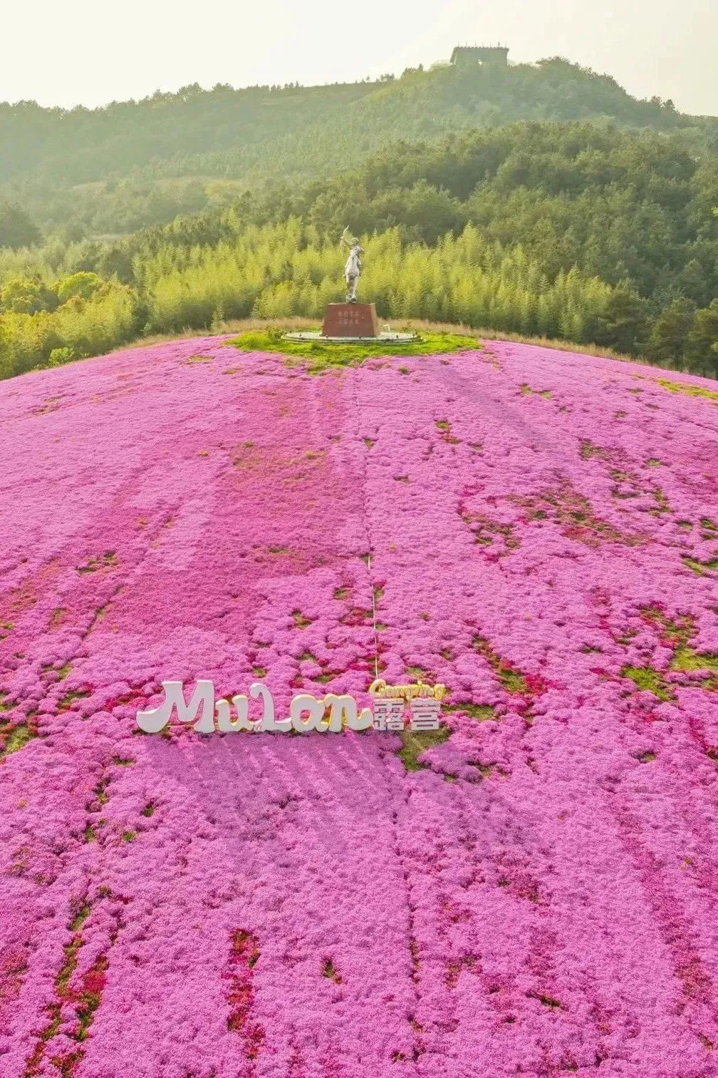 木兰草原130万株芝樱花即将成片盛放,会密密麻麻开满4000平方米呢!它们团团围住花木兰的铁骑雕像,将整座小山坡都染上春意。站在绵延的芝樱花海前,像置身于一块鲜艳的粉红地毯上,被大好春光簇拥。