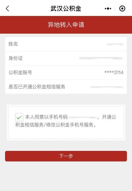06确认手机号无误,并勾选同意开通公积金短信服务/修改公积金短信服务手机号码。点击“下一步”。